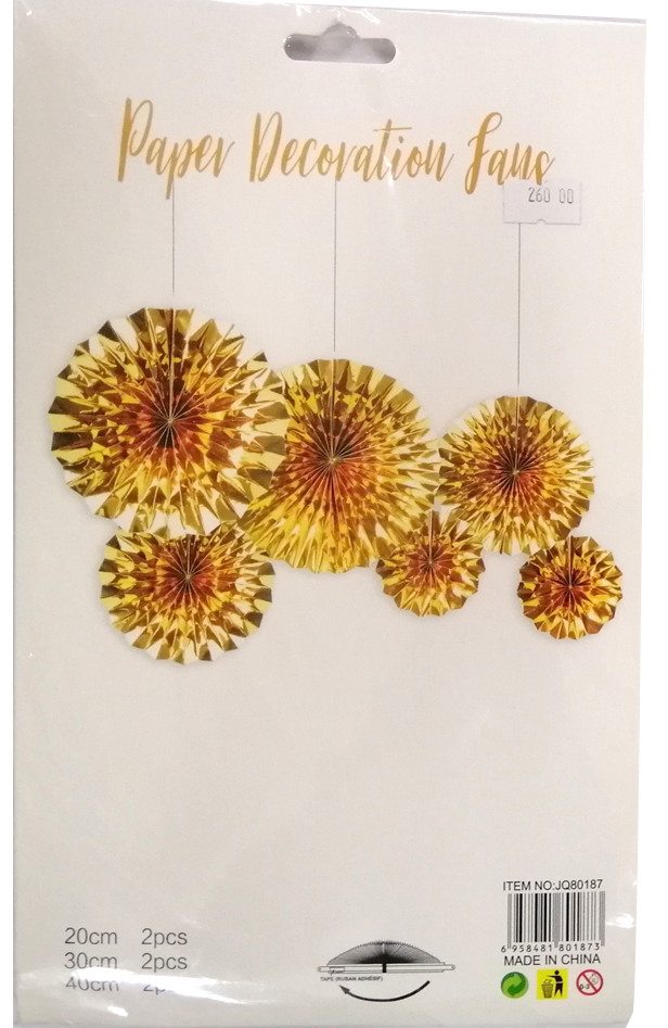 Create a whimsical party atmosphere with this paper decorative fans. Fan Paper Decorative Gold. Generally, purpose-made handheld fans are folding fans, which are shaped like a sector of a circle and made of a thin material (such as paper or feathers) mounted on slats which revolve around a pivot so that it can be closed when not in use. This is one of the ideas for the party decoration that's attracts all the visitors and catch everyone attention. Paper Fans Party Decoration Paper Decoration best for Birthday, Wedding, Graduation etc..