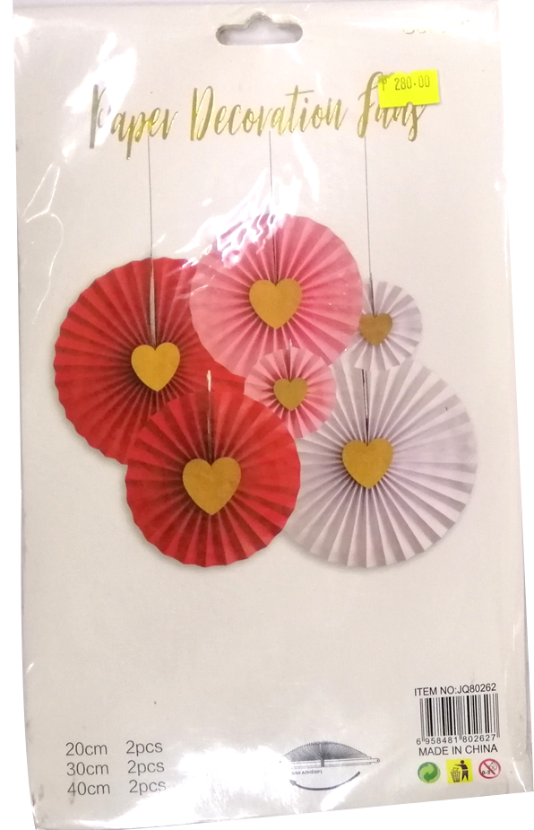 Create a whimsical party atmosphere with this paper decorative fans. Fan Paper Decorative Heart Design. Generally, purpose-made handheld fans are folding fans, which are shaped like a sector of a circle and made of a thin material (such as paper or feathers) mounted on slats which revolve around a pivot so that it can be closed when not in use. This is one of the ideas for the party decoration that's attracts all the visitors and catch everyone attention. Paper Fans Party Decoration Paper Decoration best for Birthday, Wedding, Graduation etc..