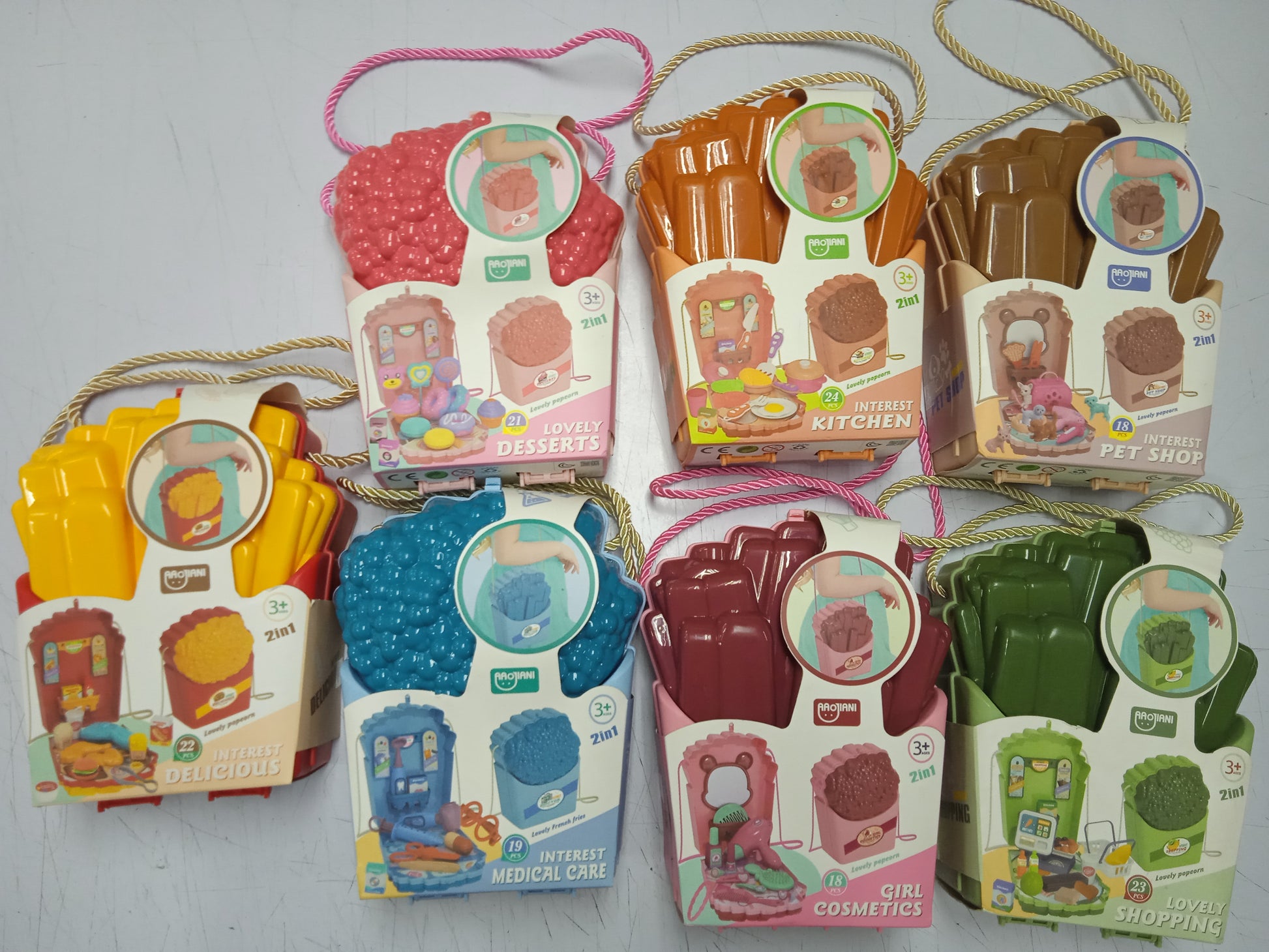 Lovely Shopping Sling Bag 2 in 1 from a lovely different color and design popcorn and French fries sling bag to 23 pcs. items inside. Interesting play brings children fun and more imagination.